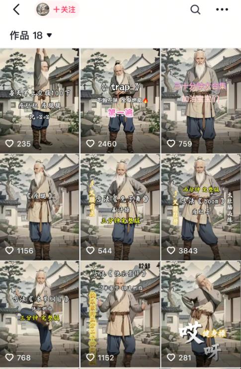如你要做下面这种古人健身操、或者古人养生类型的账号,那用ai批量起,今年的这个节点就会比较容易。